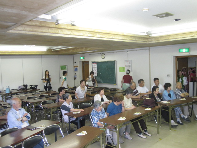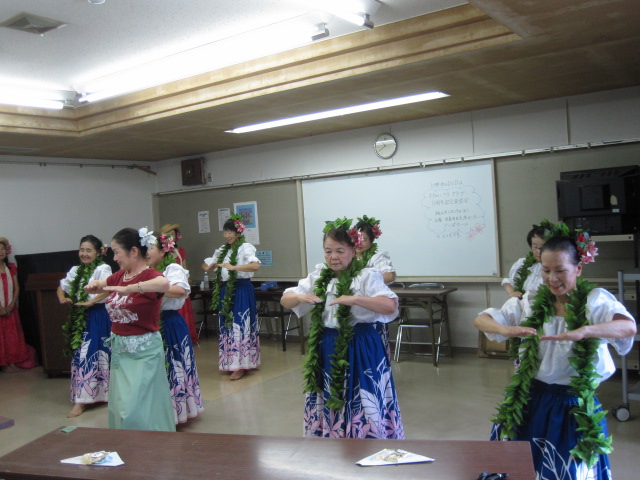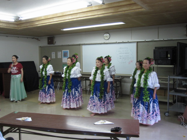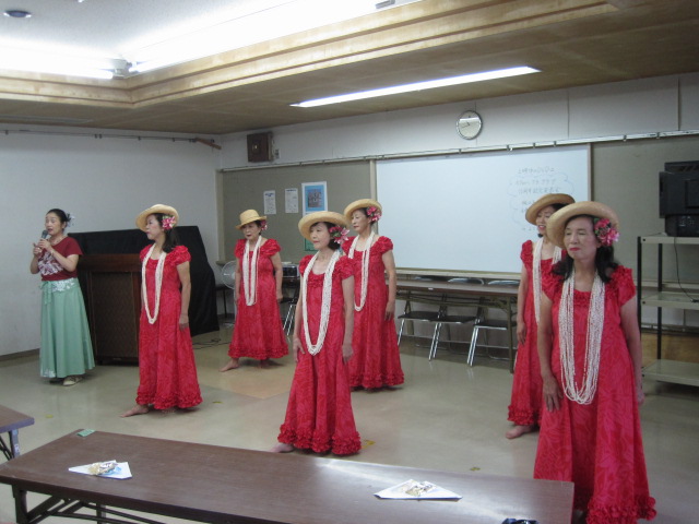 | 定例運営委員会ですが、皆さん不安定なお天気続きなどで疲労 感漂うなか,フラダンス鑑賞の誘いにのって『いきいきサロンひま わり』への参加となりました。(実は、いきいきサロンにフラダンスの方 に来ていただいて、oniビジョンの取材まで呼んでいるというのに、不安定な 天候のためか、参加者が少なくて気の毒だということで、サクラに頼まれ、 取材も兼て、参加することにしたのですが・・) 「ホアロア・クラブ」のみなさんの元気いっぱいのフラダンスに、 気難しいパソコンあいてに格闘している身には(勿論充分使い こなして楽しんでいる方もいます)楽しい時間になった。 『フラダンス』初めて見るわけではありませんが、顔見知りの方が 懸命の取り組んでいる様子と、生命を謳歌・賛美し風にも波にも 命吹き込む素晴らしいダンスに、先生の巧みな誘導もあって全員 でダンスに溶け込んだ。 (水原美津夫) |