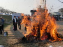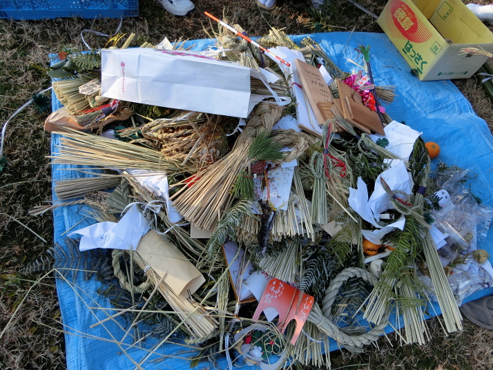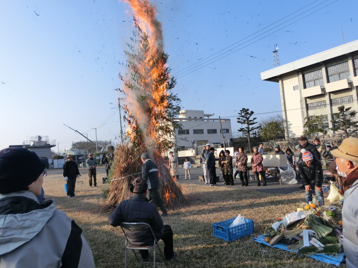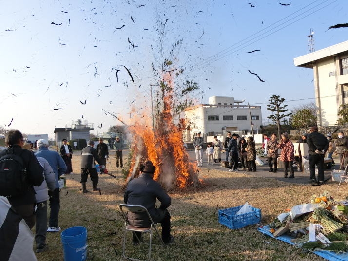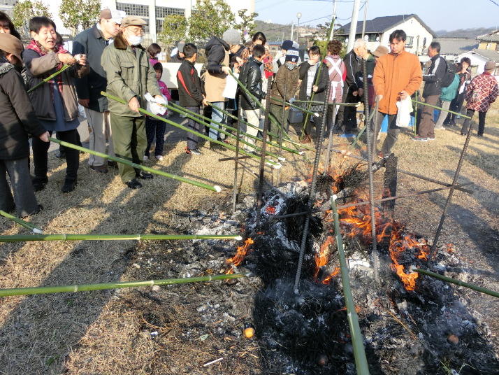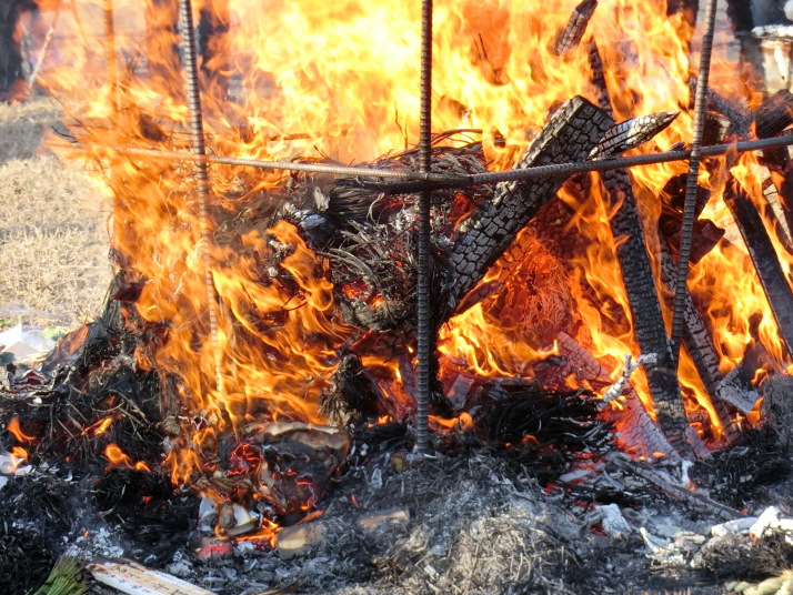 | 平成27年1月10日(土)三野町内会では「とんど祭り」を行いました お飾りをもやす(おはやしするが正式) また灰を四隅にまくと1年間は火事をださない 書初め半紙を燃やすと字が上手くなる まず始めに町内会長と宮司さんのご挨拶がありました 竹の節ががドンドンとはねる音がとんど焼きの名前の由来とのお話がありました とんど焼きの火で焼いたおもちでぜんざいをいただきました 皆様と一緒に無病息災を祈って灰をいただいて帰りました 本年度もどうぞよろしくお願い申し上げます 写真をクリックすると大きくなります 黒籔美代子 記 |