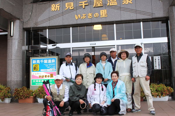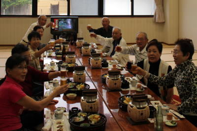 美肌の湯、千屋温泉入浴後は楽しい昼食。 雨がやむ気配がなくノーアルコールでマイクを手にするクラブ員も。