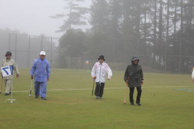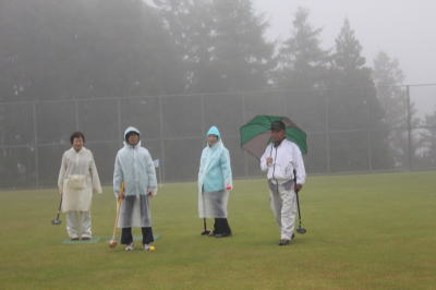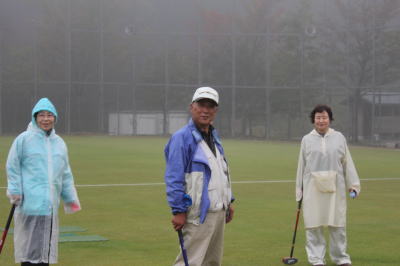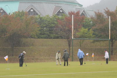 気になる雨、少し小降りになり勇を決してプレイ再開。 再びグラウンドゴルフ場へ。 |