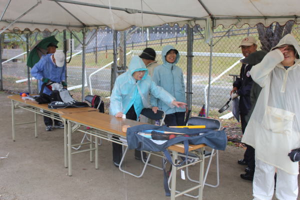 | テントの中にも激しい雨が降りこみ試合中止。 でも皆さん笑顔で会話しながら、クラブ、ボールを終い、昼食へ。 |
