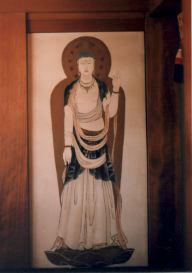 昭和10年、東京芸術学校次席卒業、在学中帝展入選、昭和63年卒、享年78才。中西画伯について特筆したいことがあります。それは脇田の安養寺本堂の壁、天井の「絵」です。何日もかかり苦労されて制作されたと聞いております。御住職の特別の許可をいただき撮影しました。絵の意味するところは何か、素人の私にはよくわかりませんが興味のあるお方は是非鑑賞してください。壁画のなかの一枚です。三途の川の向こうに綺麗な人がいます。早く来なさいと。あなたはどうされますか。の様です。壁画8枚、天井画12枚。(文責:大森晃)