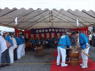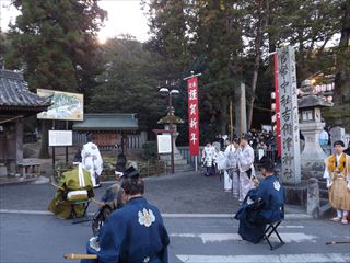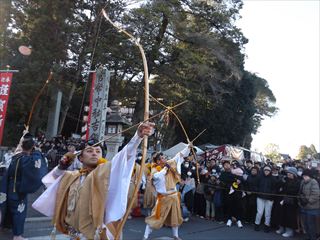 | 内容 | 矢立の神事 吉備津神社で侍と山伏に扮した岡山県弓道連盟の射手6人が「やー」の掛け声に合わせて次々と矢が四方へ勢いよく空へ飛んでいきました。 国家安泰や五穀豊穣を願って行なわれています。 本殿の広場では吉備津三味線餅つき保存会が中心となり地域住民と一緒に、歌に合わせて賑やかに餅つきが行なわれていました。大きな絵馬の前では次々と家族やお友だちで写真を撮る光景が見られました。 神社周辺は多くの人と車で混雑していました。 鯉山学区連合町内会 会長 練尾賢治 |