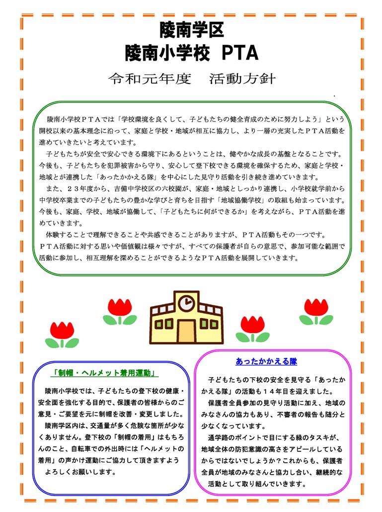 | 6月 | 岡山市PTA協議会総会(1日) 5年生 田植え手伝い(6日) 救命講習会(7日) 教育講演会(22日) PTA新聞「陵南」118号発行 |