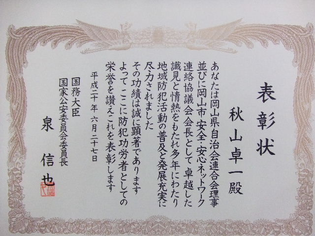 | 秋山連合町内会長国家公安委員長より表彰される |