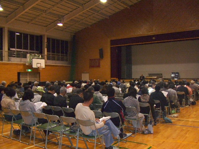 | 平成20年10月30日午後7時から庄内小学校体育館において 岡山市の家庭ゴミ有料化説明会が開催されました。 |