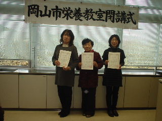 | 2月18日 岡山北保健センターで平成26年度栄養教室閉講式がありました。 生石より3名の受講生が1年間受講し無事修了されました。 三柳直美さん、荒木千佳子さん、青井京子さん、おめでとうございます。 27年度からはれて栄養委員です。皆さんと地域で活動いたしましょう。 |
