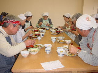| 1月30日、高松公民館で、平成26年度健康増進重点プロジェクト事業の栄養教室 (糖尿病予防)を開催しました。 高松地区の生石・高松・加茂・鯉山4学区の栄養改善協議会が主催でした。 高松地域の民生委員さんたち14名と栄養委員14名、 高松アクティブホーム山本咲希管理栄養士といきがいライフ池田実樹子 管理栄養士を迎えました。 おかやま市民体操を全員で実施、続いて、「糖尿病予防と食事」の講話は、 生活習慣の改善と実践について栄養士より、予防と改善7カ条を中心に バランスの良い食事と運動についてわかりやすく説明がありました。 調理実習は学区毎に4班に分かれて参加者と栄養委員が手際よく 調理できました。 美味しく試食し、感想もいろいろでしたが、男性より「帰って妻に言います」 にみんな大笑い 奥様の苦労がわかったようでした。夫婦で参加されていた方もあり、 夫々の言い分にも耳を傾けていました。 午後から、歯科医師の竹谷雅之先生の「歯と健康」について、 プロジェクタ-を使って、講話されました。 身近な歯についてですが、健康に歯が大変関わっていることを 身にしみて感じたようで、質問も相次ぎ、時間切れで終わりました。 一番大切なことは、毎日の歯磨きと歯垢を年2回は検査して 歯垢を増やさないこと と結論されました。 味噌汁の塩分測定もして、実り多い教室となったようでした。 皆さんのご協力ありがとうございました。 |