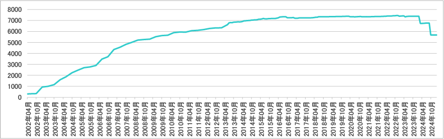 電子町内会に参加されている町内会全体の会員数の推移グラフです。 全電子町内会の会員数合計は5,667人です。