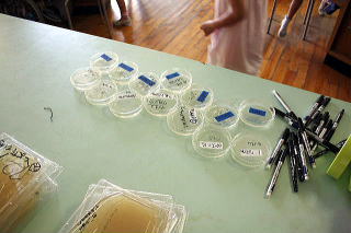 | 実験II 「どんなものに菌がたくさんついているかな。いないかな。」 (1) 身の回り、学校の周りにあるもので、「菌」がいっぱい付いていそうな物(A)と、 「菌」があまり付いてなさそうな物(B)を班のみんなで考えて決める。 ※ 9cmのシャーレに入るものなら、石でも葉っぱでも消しゴムでも何でもOKです。 (2) 班長は班員1,2名と班で決めたサンプルAtoサンプルBを取りに行く。(10分以内) (3) (2)と同時進行で副班長と残りの班員は2つのシャーレの蓋の上に「サンプルの名前」、 「班番号」、「日付」を書く。副班長は黒板と実験データシートにも記入する。 (4) サンプルAを寒天培地1枚に10秒くらいくっつける(少し塗る感じでもOK) (5) サンプルBを寒天培地1枚に10秒くらいくっつける(少し塗る感じでもOK) (6) シャーレを前に提出する。 |