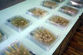 | 実験I 「どんなところに菌はうようよしているだろうか?」 (1) 菌がたくさん居そうな場所(理科室周辺で)を班のみんなで考える。 (2) 場所が決まったら、副班長はその場所を黒板とデータシーtに記入する。 (3) (2)と同時に班長は寒天培地の入ったシャーレの蓋に班の番号を書き、班員2,3人で その場所にシャーレを置きに行く。 必ずシャーレの蓋を開ける。 |