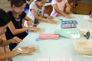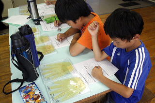 | 実験III 「手にも本当に菌がすんでいるのかな」 実験IV 「いつも手はきれいに洗えているのかな。手を洗うと菌は居なくなるのかな」 手洗い後のパームスタンプの様子をスケッチする。手洗いの結果から何が分かったか話し合う。各自感想をプリントに書く。班長と副班長がシャーレ、パームスタンプを袋に入れて提出、処理してもらう。 |