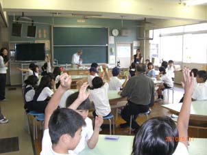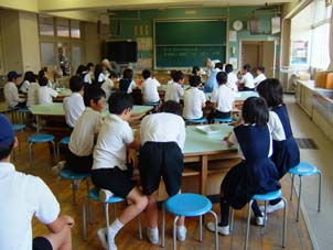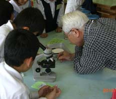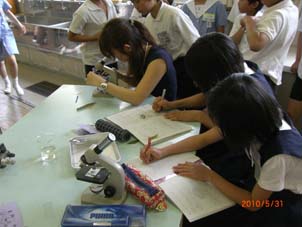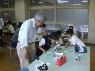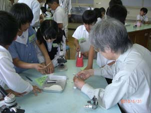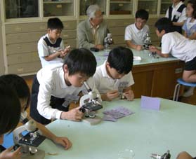 | 顕微鏡を使って、タマネギの薄い皮で平面に並んでいる細胞を観察し、つぎに、サザンカの葉で植物が炭酸同化作用や呼吸をしているときに気体の通路になっている気孔を観察した。最後の時間の余裕のあるものは、アオミドロで細胞の連なりを観察しました。動植物が細胞から成り立っていることを実感しました。参加者41名 |