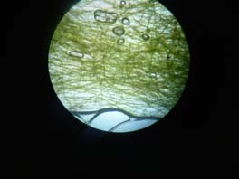 | 実験手順 1. タマネギをcm角に切り、果肉の間の内皮をピンセットで取りだし、スライドガラスの上に水滴を1滴垂らしたところに置き、カバーガラスで押さえた後、顕微鏡で観察する。 2. 透明なプラスチック板に薬品 ? を塗布して葉の裏側に5分間、密着さておき、表皮をはぎ、中央に穴の空いた台紙にセットして観察する。 3. アオミドロをほぐして、スライドガラスに載せ、カバーガラスで押さえて観察する。 顕微鏡は対物レンズ 4X、10X、40X, 接眼レンズ 30X を使用した。 |