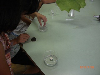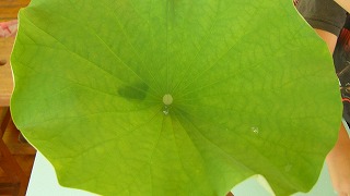 | ハスの葉に水滴を垂らして観察です。暑さの為、ハスの葉がすぐにしおれてしまいます。 | |