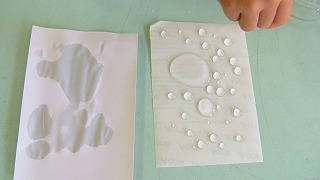 | 紙に水滴を垂らして観察、紙質の違いによる変化をみます。 | |