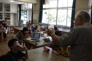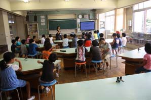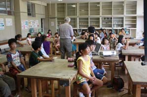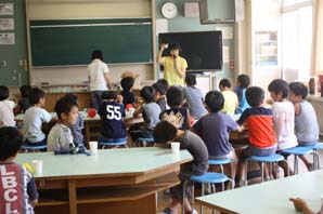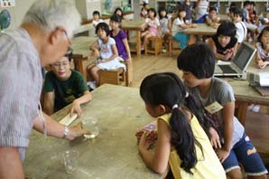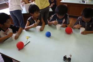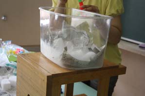 | 最後はシャーベットつくり、紙コップにジュースを入れ、細かく砕いたドライアイスを入れまぜるとシャーベットができた。おいしかった。 | |