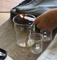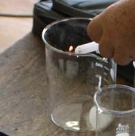 | ドライアイスをビーカーの中にいれ、ビーカーの外では”ろうそく”は普通に燃えるが、ビーカーの中に入れると、二酸化炭素は重いので、下からたまる。二酸化炭素と空気の境界のところでは炎の上側空気中にあるところだけが燃え、下の二酸化炭素が回りにあるところは燃えないで光らなくなる。ローソクを上下さすと光って燃えるところは大きくなったり小さくなったりする。(蝋のガスの輪郭は見える)「右側の写真」 | ||