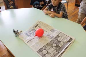 | ドライアイスの小片を風船にいれると、昇華して気体となり、風船は膨らむ。これと同じ大きさに別の風船に空気をいれ膨らます。重さを比べる。どうしますか。二酸化炭素のほうが重い。二酸化炭素の気体は空気の1.5倍くらい重い。 | 大きなプラスチック容器にドライアイスをいれ、適当に二酸化酸素がたまったところで、シャボン玉作って吹き込むと、途中に、ほとんど水平に並ぶ。シャボン玉は膜の中が空気なので、重い二酸化炭素の気体の中には入れない。 |