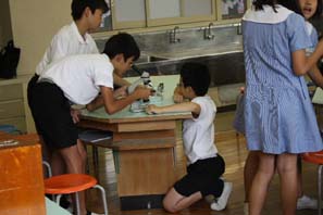 顕微鏡はじめての低学年はたまねぎの皮と青み泥で細胞とはどんなものか観察した。