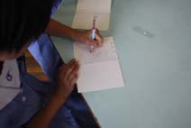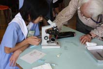 ○ ジャガイモとサツマイモを切ってスライドガラスに押し付けて中身を取り、水滴を1滴たらしてカバーグ(ガ)ラスで覆い資料とする。顕微鏡の試料台乗せ対物レンズを倍率の低い方からX4,X10, X40と倍率を「あげて観察する。なれないと対物レンズの倍率40はピントがあわせにくい。光を入れる反射鏡の扱いにも皆苦労しました。
