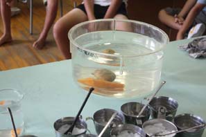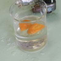 ビーカーに水を入れ、ニンジンを入れる。 沈む。