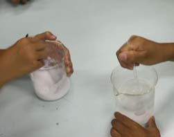 実験b  1. もう一つ、 100ml の飽和食塩水を作り、氷水に入れて急冷してみる。
