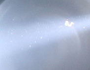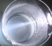 析出した塩の結晶 急冷して微結晶が出来る。 左の写真を拡大。光束の中に光る点がいくつか見える。