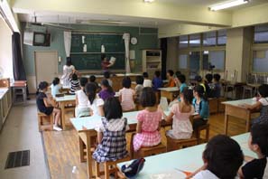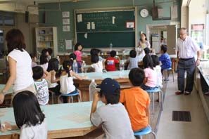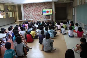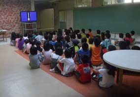 | 最初にJAXA作成のビディオを20分あまり見て原理を学びました。ついでビディオで聞いたようにペットボトルを加工して、指導者から聞いただけ水をいれ自転車用のポンプで空気を入れ、そのエネルギーでペットボトルを飛ばしました。暑いにもかかわらず皆頑張りました。 |