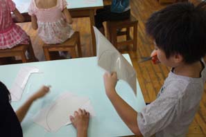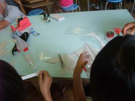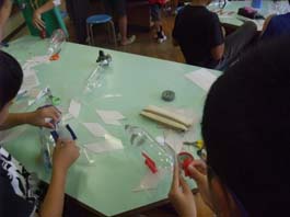 | 低学年は羽までつけず、先の尖ったキャップだけつけて飛ばしました。話は聞いたのですが、用意不足で頭にゴムネンドの錘を入れなかったので、水が無くなるとペットボトルは失速して落ちるのが多かったです。 高学年は羽をつけたのですが材料の強度不足であまり役に立っていなかったようでした。だけど参加者は羽をつければ飛行が安定すると理解してくれました。 |