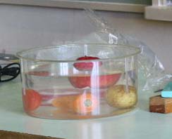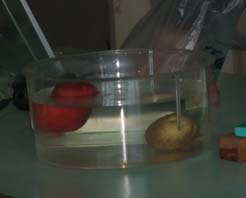 | 【演示実験1】 木片、粘土、りんご、人参、ジャガイモ、トマトなど 水につけてみる。 |