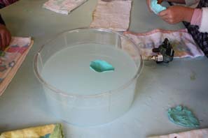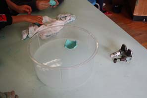 | □ 透明水槽に水を8分目ほど入れる、各テーブルに配る。 □ ゴム粘土の一袋をを5等分したものを受講者各人に渡す。 |