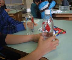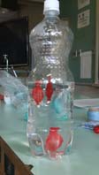 | 【浮沈子の作成】 □ 児童に持ってきたペットボトルを取りに行かす。 各人に「たれびんの魚」にナットをつけて重さを調節したものを配る。 |