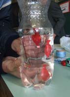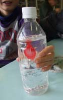 | 【各人作成】 浮沈子を作成さす。 ● 魚のなかに適当に水をいれ魚が水の上下の途中に位置するように調整する。 ● ペットボトルの栓をした後、ペットボトルに圧力を加えると浮沈子が上下する。このとき、魚の中に水が出入りしていることに気づかせる。 〜 潜水艦の原理 |