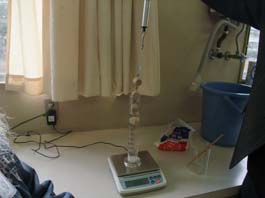 | ● 錘5個をバネ秤で吊るしながら、秤の上に置かれたメスシリンダーの水に沈めていく。 |