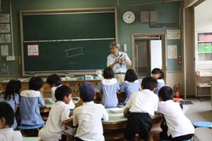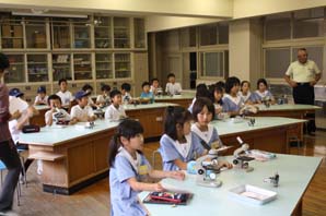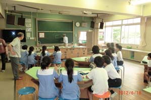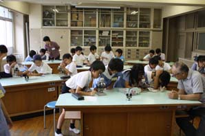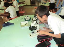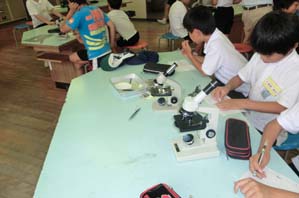 | 4年生の顕微鏡初めての児童は動植物の体の基礎になっている細胞をたまねぎの皮で観測しました。たまねぎの皮の内側をピンセットでつかみ出し、スライドグラスに乗せ、カバーグラスを乗せ観察しました。またアオミドロで細胞が縦に連なっているのを観測しました。 |