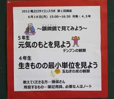 | 5年生は我々の元気の素の食料、そのうちの炭水化物:でんぷんを観測しました。じゃがいもを切ってスライドグラスにこすりつけ、カバーグラスを載せて観測した。また、とうもろこしのでんぷん粉を、少量スライドグラスに乗せ、水滴を1滴たらした後、カバーグラスで覆い観測しました。 |