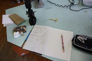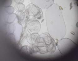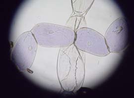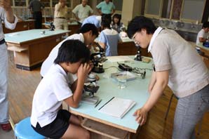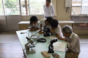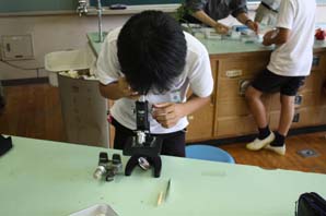 | 今回は4,5年で顕微鏡を扱った経験のある子供さんを対象に、原形質流動と色の付いた植物から、色付いた細胞を見つけることを目的に実験を行った。材料はムラサキツユクサのおしべ(の毛)と色の付いたパプリカと人参を用いた。全員成功とはいかなかったが、細胞内を動く粒子も見つかった。薄く切って試料を作るのも大変だったが、色のついた細胞を見つけることができました。前回の材料もあったので、でんぷんも観察した。ちょっとコツを習ってデジカメで上手に写真を撮る子供も居た。 |