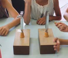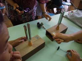 | 高学年の組も、音さに共鳴箱をつけると音が大きくなることや、共振で隣の音さが鳴り出すことや、うなりの実験もした。 |