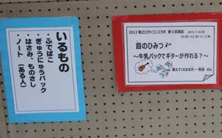 | 工作 1) 牛乳パックの口(くち)を内側に折込み、端をセロテープで止める。 2) フレットの位置を示す紙(ドレミの紙)を牛乳パックに両面テープで貼り付ける。 3) サドル(5mm角の木材)を所定のところに両面テープで貼り付ける。 4) 爪楊枝をフレットの位置にセロテープで貼り付ける。 5) ゴム輪をかけて、ギターを完成させる。 {演奏}簡単な曲を全員で合奏する。 |