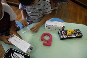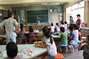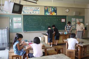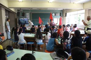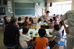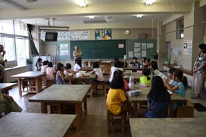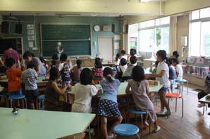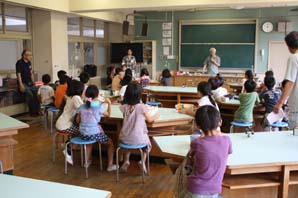 | 低学年では、1) 音の性質を体感させる。 2) 簡単な楽器を作って楽しむ。 低学年は、人数が多すぎたので、1,2年生と3年生に分け、平松が片方のクラスを担当した。 |