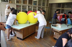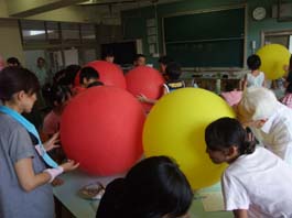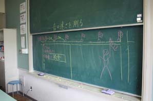 | 高学年は、 音の性質をいろいろ体感し、 2) 音が伝わるには時間がかかっているらしいので、音速の測定をしました。6年生が実測し、4,5年生は50メートルごとに立っている測定者が 旗で合図するのを校舎の3階から見て音の伝播を実感した。3) 風船電話で音の伝達を楽しんだ。 |