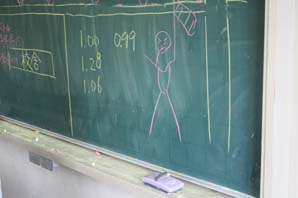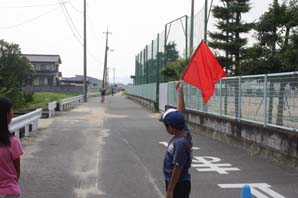 | 50m毎にあたを振る係りを配置、 音を聞いて旗が順次降ろされるのを、 4,5年生が校舎の3階から観測。 |