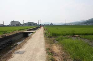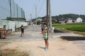 | 1) 校庭の南の農道に50mおきにコーンを置き、手旗係の児童がコーンのそばに手旗を持って西向きに立つ。 2) 計時係りの児童(5人)は、ストップウオッチをリセットして待つ。 3) 一番遠くに居る児童の合図で、手旗係は手旗を上に上げる。 4) 全員の手旗が上がったのを確かめた後、ピストル係が運動競技用のピストルを撃つ。 5) 手旗係の児童は、音が聞こえたら、手旗を降ろす。 6) 計時係はピストルのところの旗が降りたのを見て、「スタートボタン」を押し、一番遠くの旗が降りたのを見て、「ストップボタン」を押す。 7) 記録係は時間を記録する。実験は2〜3回繰り返す。教室に帰って音の速さを計算する。 |
