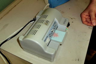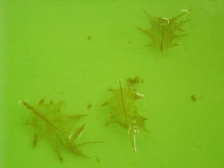 | 今回の材料はヒイラギで、水酸化ナトリュウムの溶液に材料を浸して、さらには加熱して、葉肉を溶かす作業は、指導者で行って、水洗いした材料を貰ってから参加者は作業をした。 |