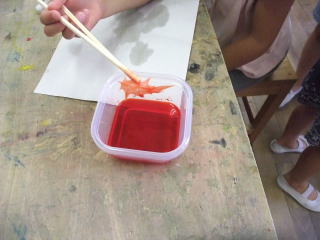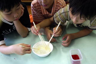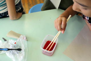 | 漂白剤で漂白。水洗後、水分を取る。 | 食紅で色をつける |