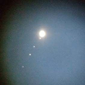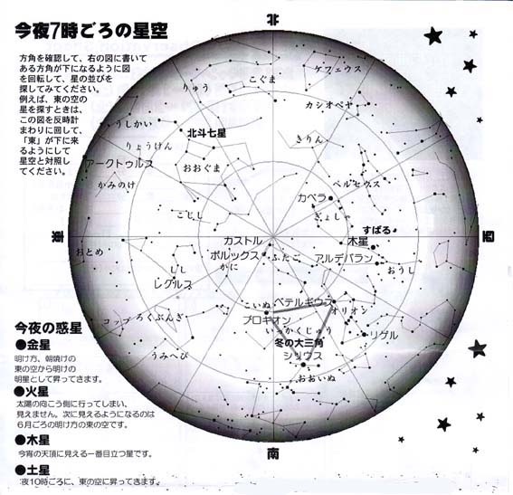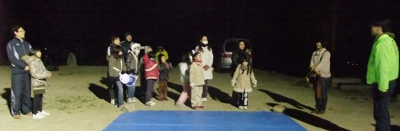 | 最初、彗星が見られるかも知れないと期待しましたが西の空少し雲があり見えませんでした。その後、冬の大三角形などの星座の話と「夜空の明るさ世界同時観察キャンペーン」の話を聞きました。5台も持って来てくださった望遠鏡で木星を初めたくさんの星や星団を星雲を観測しました。北斗七星やカシオペヤからの北極星の見つけ方の話も聞きました。 |