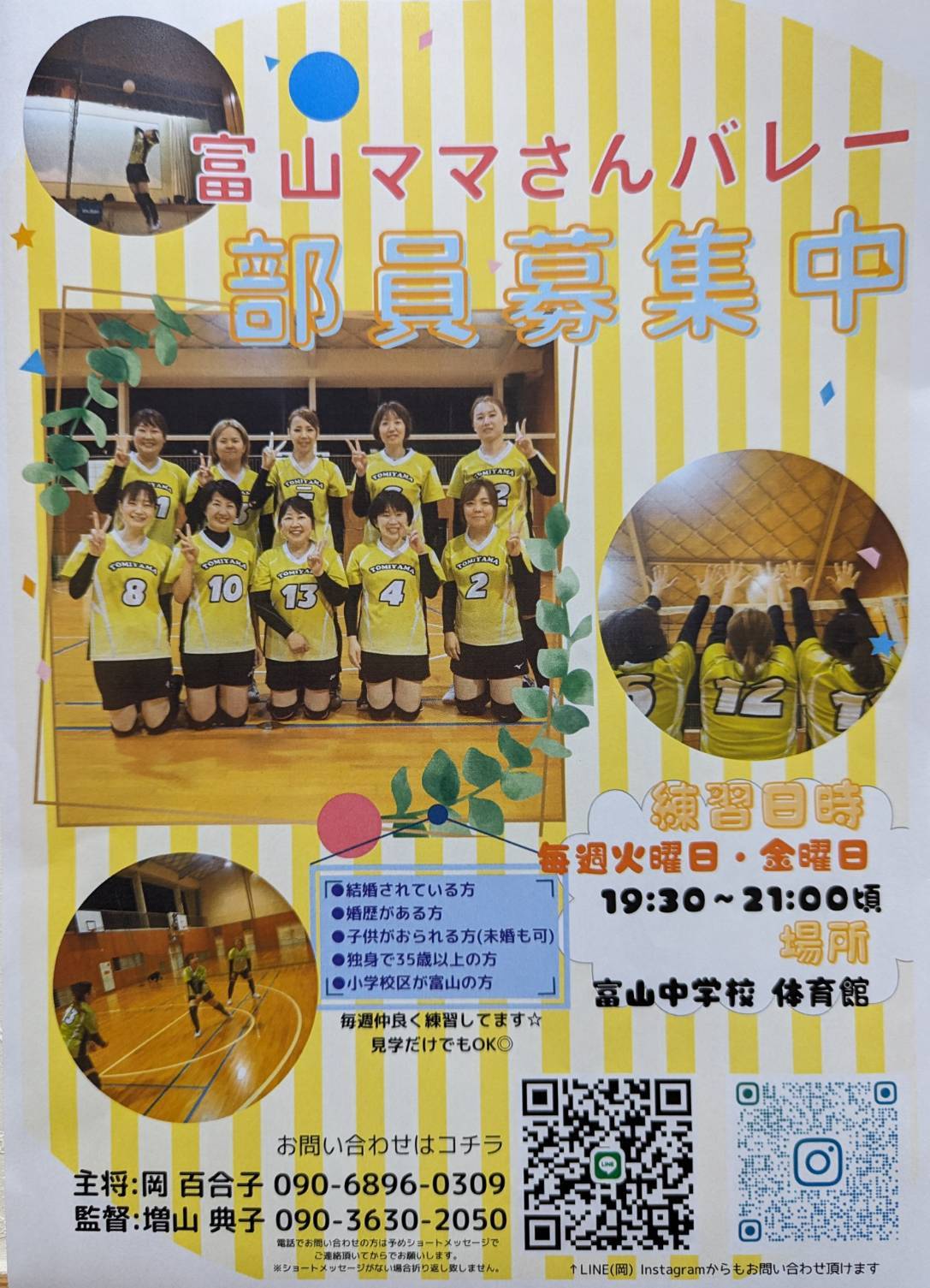 活動場所 富山中学校体育館 日時 火・金 19:30〜 部費 月 1,000円