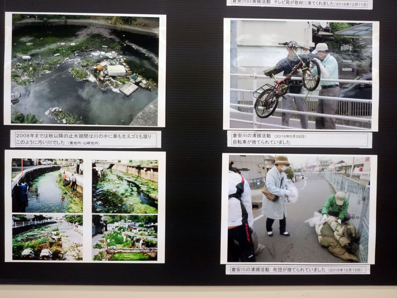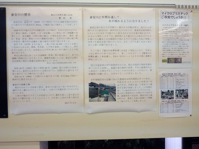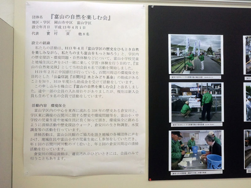 展示物は、富山の自然を楽しむ会設立(2001年4月1日)、設立の経緯、活動内容(環境保全について)の説明も記されている「倉安川をきれいにしよう」をメインテーマにした活動写真など30枚です。