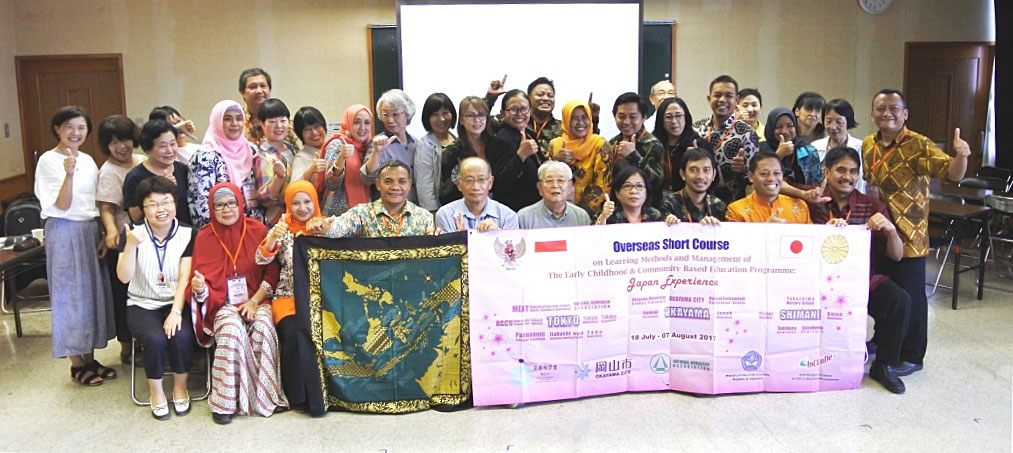 7月31日(月)インドネシアより日本の幼児教育視察の一行19人が富山公民館を訪れました。来訪メンバーは、日本の文部科学省に当たる国家教育省職員3人、公民館に当たるCLC(Community Learning Center)職員6人、幼児教育・社会教育の先生10人です。